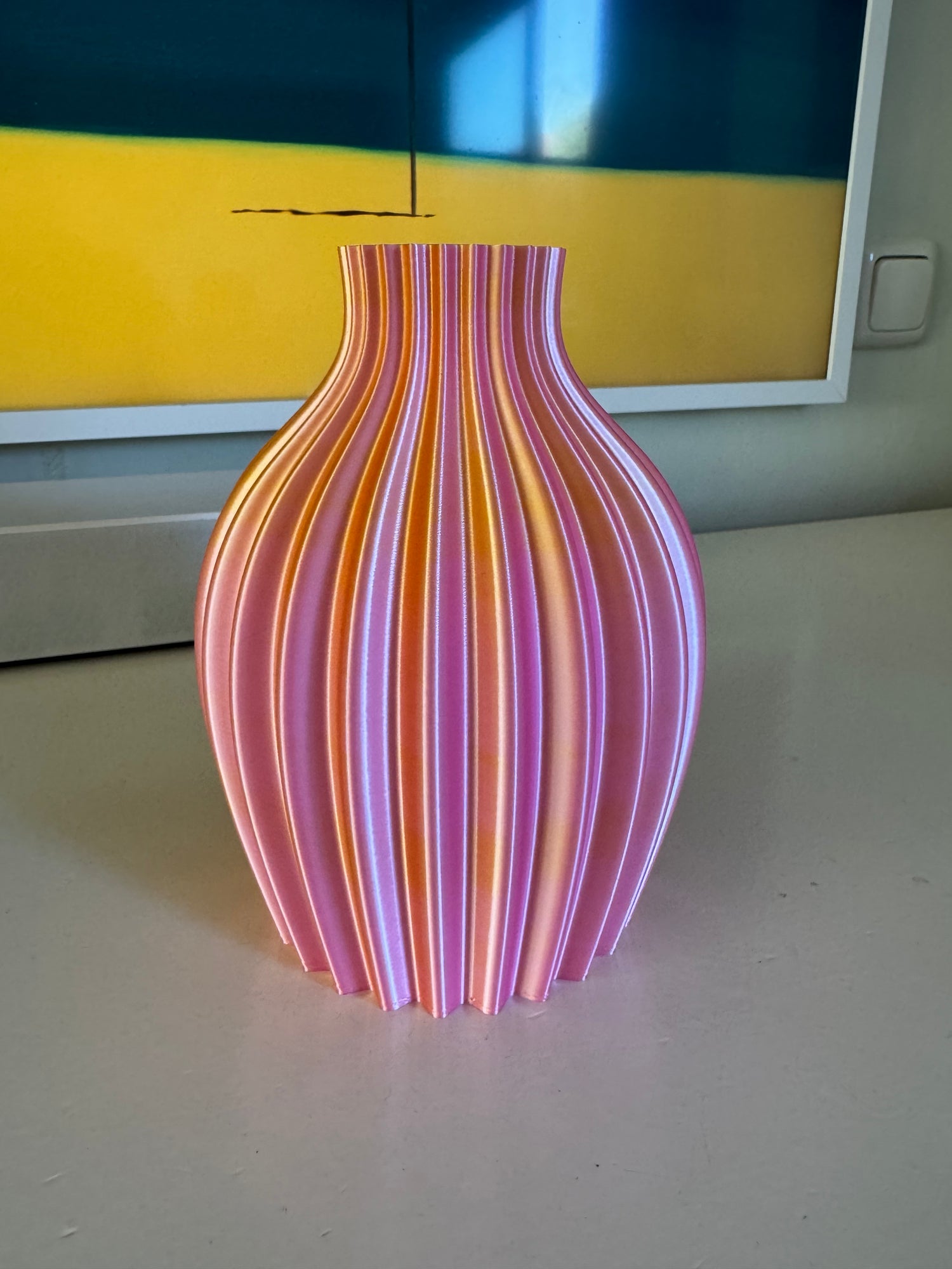 Unieke 3D-geprinte vazen in verschillende hoogtes en materialen.