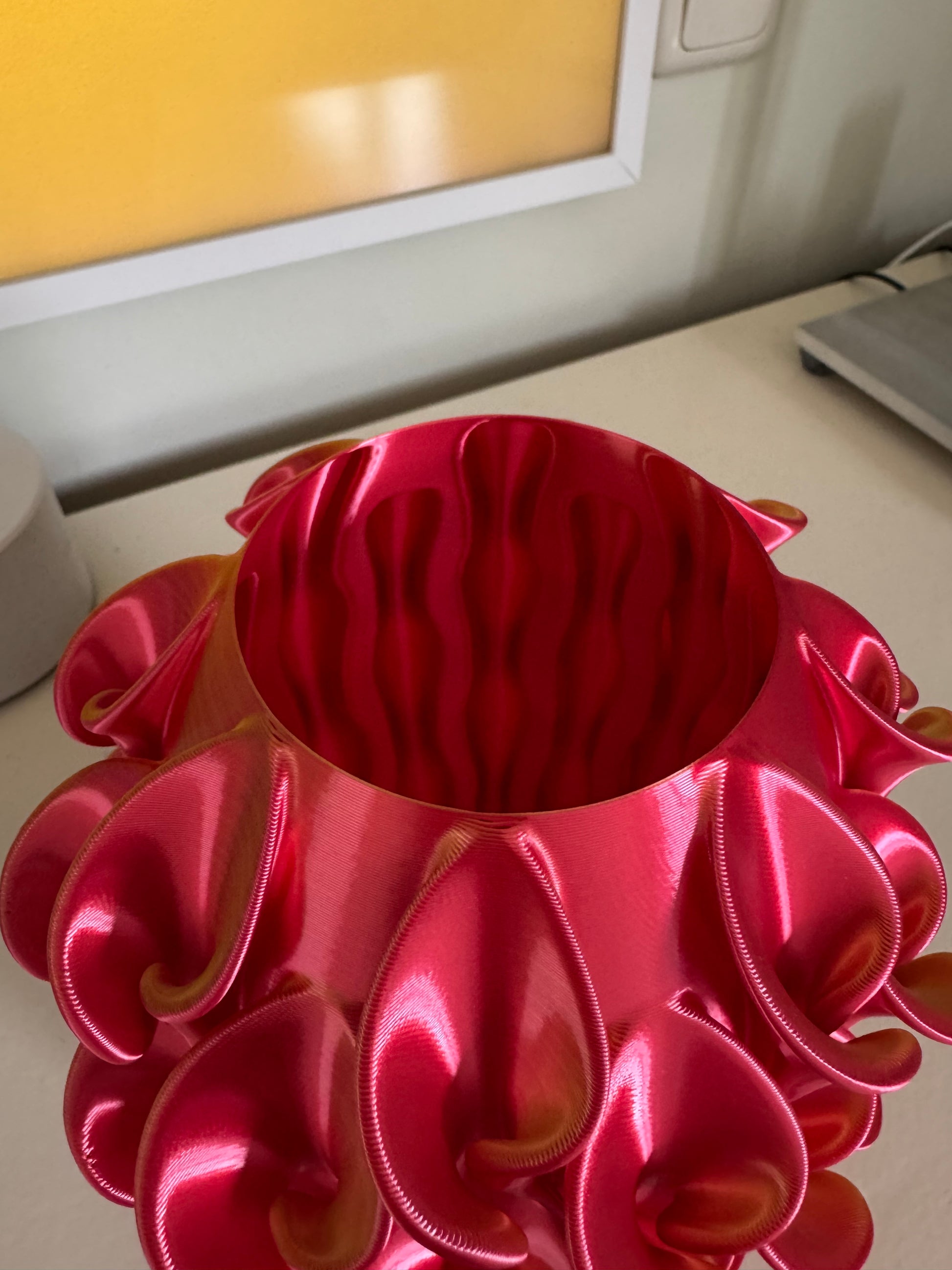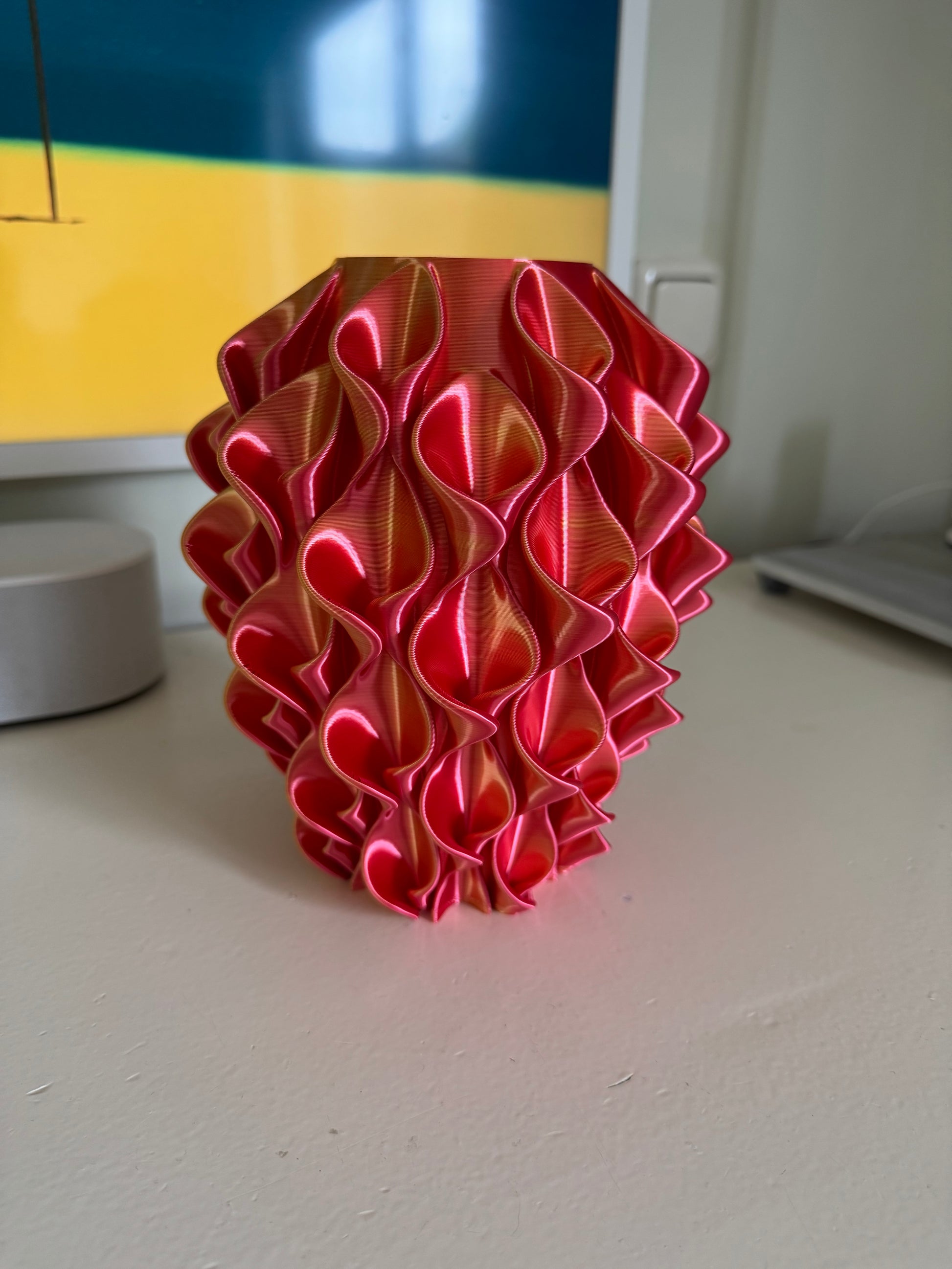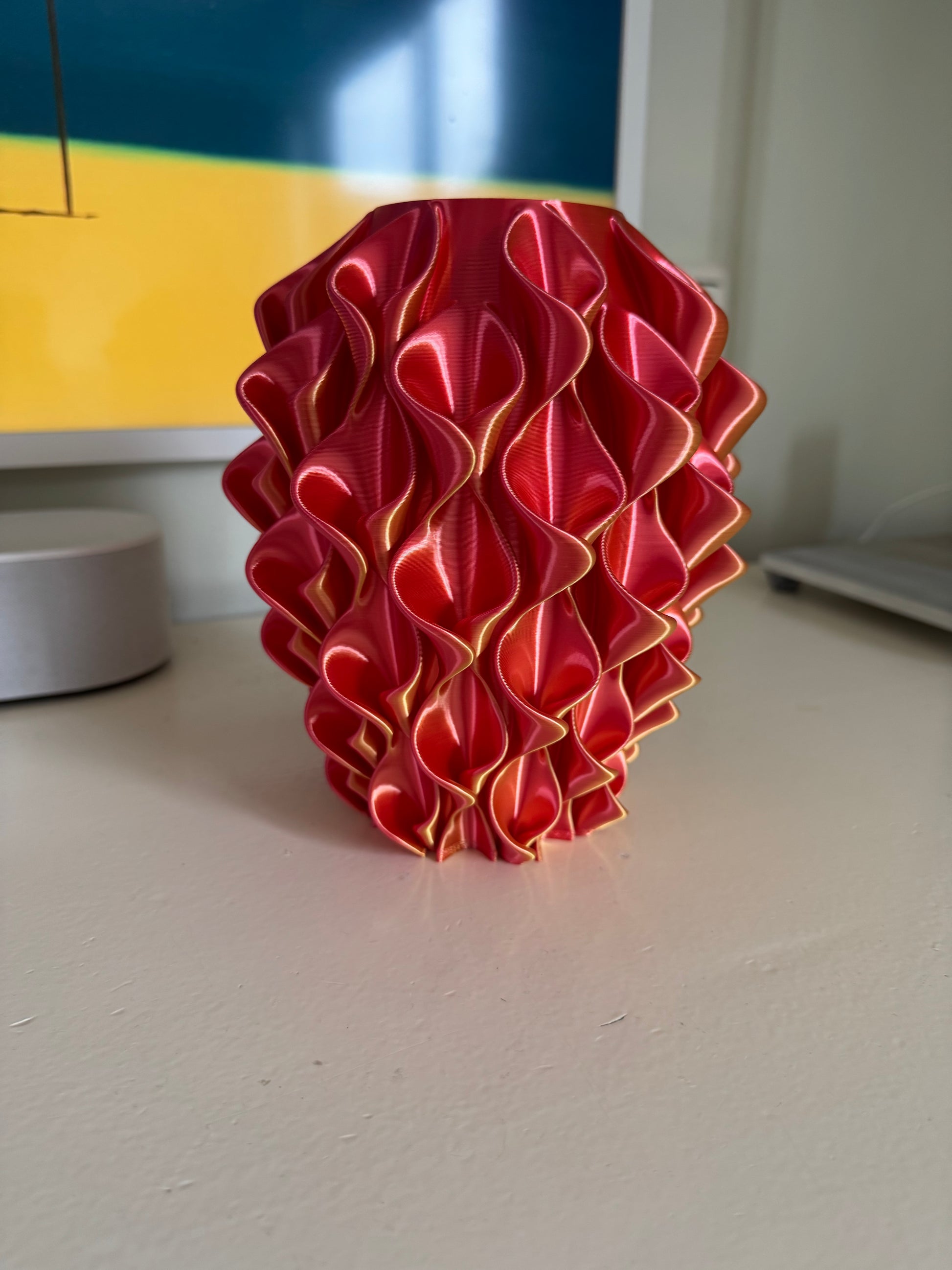 Unieke 3D-geprinte vaas, groot formaat. 24 cm hoog, in prachtig zijdeglans rood/goud. Alle fotos tonen dezelfde vaas Perfect als decoratie of voor kunst -zijde of droogbloemen. Alle foto’s tonen dezelfde vaas. Gemaakt van polylactide. Dit is biologisch afbreekbaar, biocompatibel en wordt geproduceerd uit hernieuwbare plantaardige grondstoffen. Niet waterdicht.