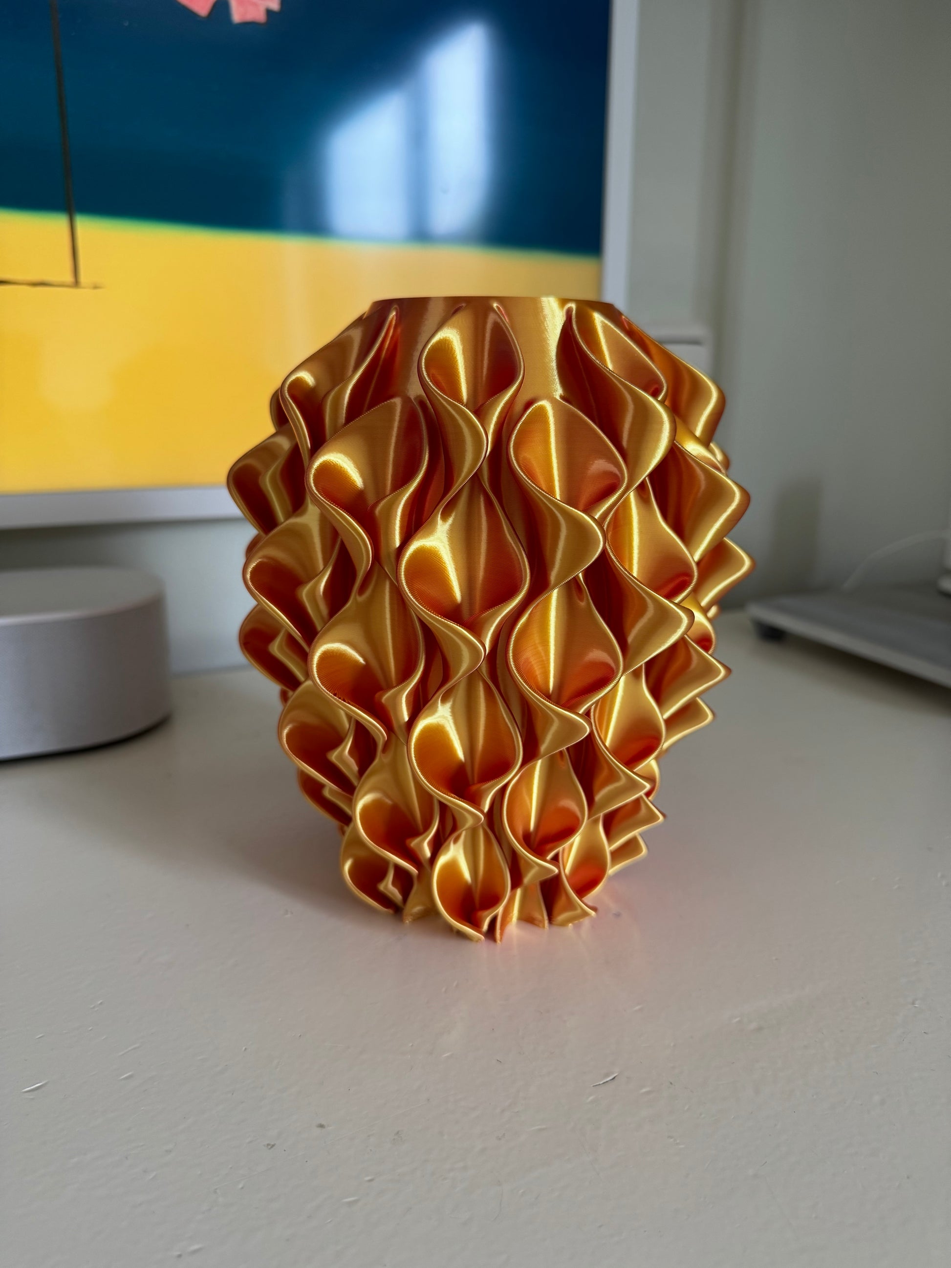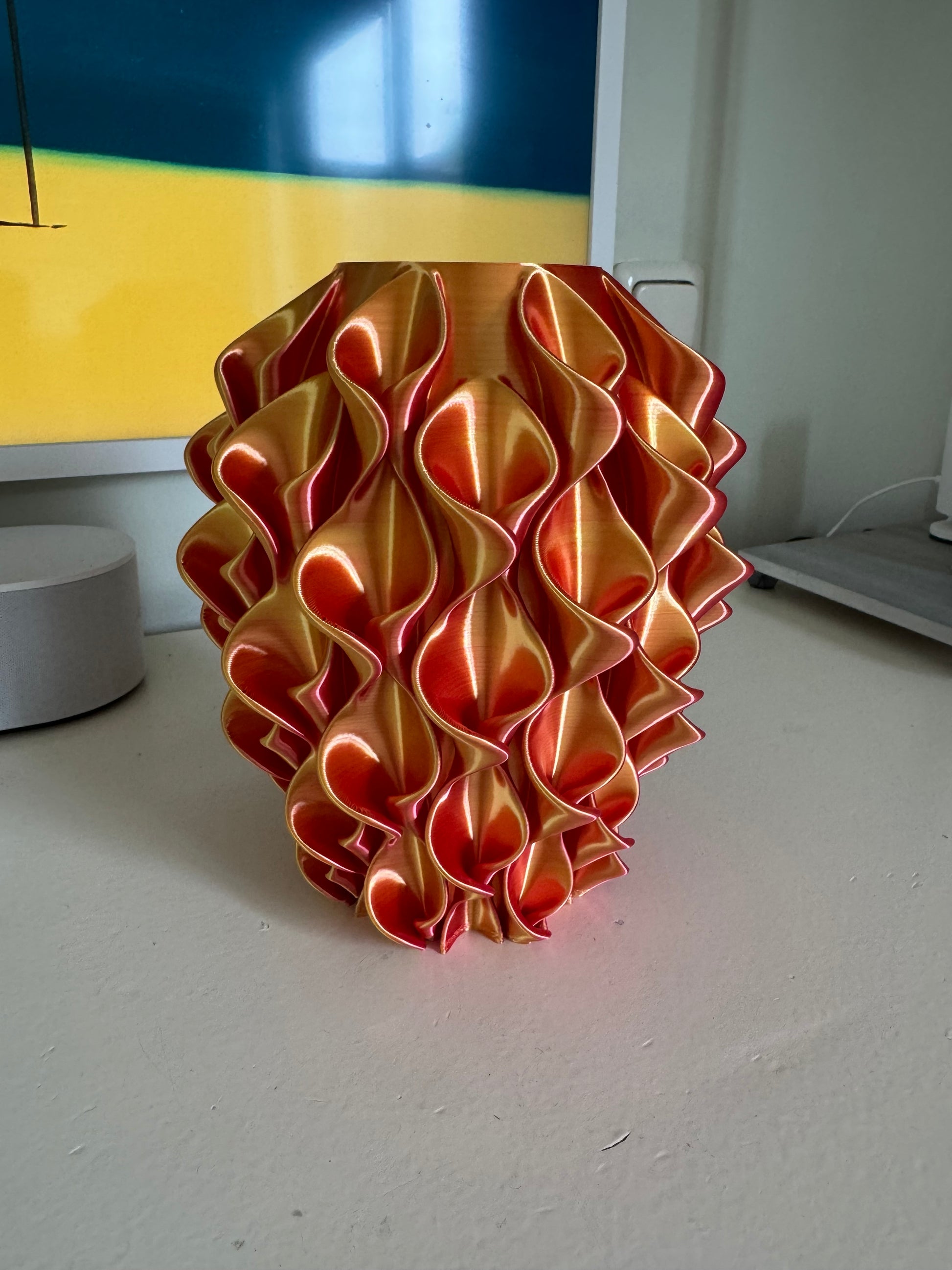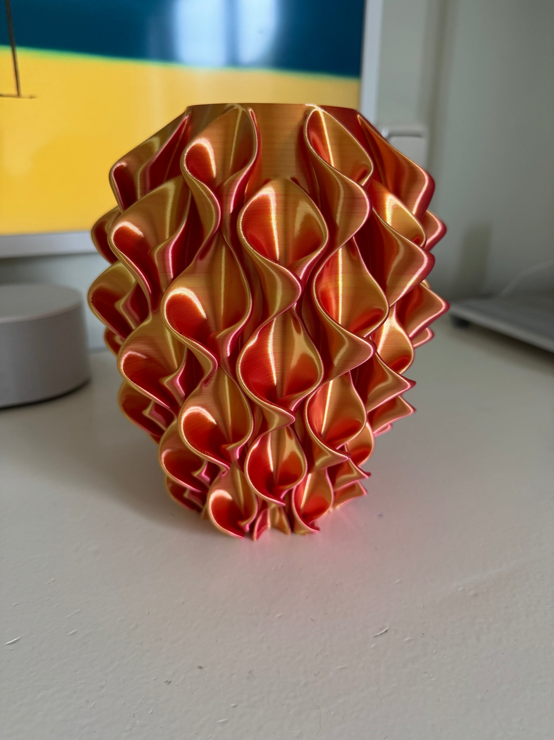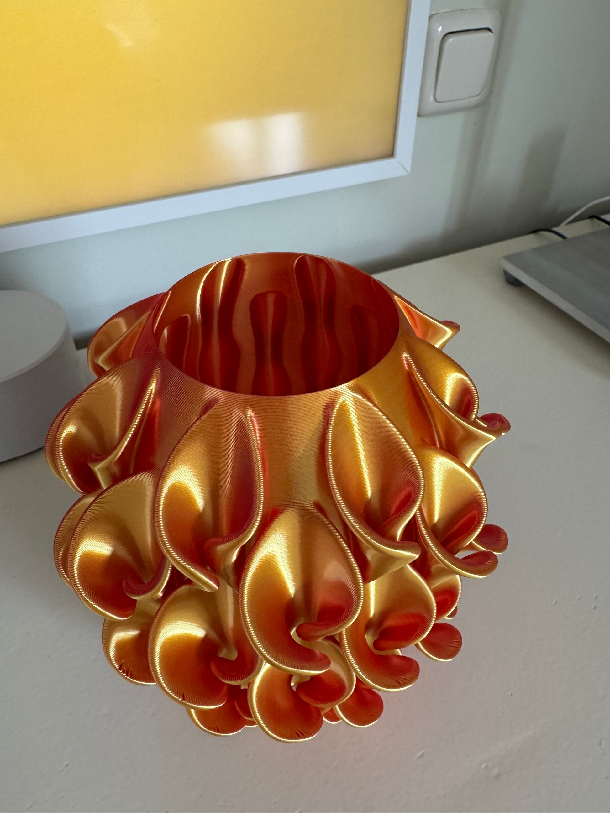 Unieke 3D-geprinte vaas, groot formaat. 24 cm hoog, in prachtig zijdeglans rood/goud. Alle fotos tonen dezelfde vaas Perfect als decoratie of voor kunst -zijde of droogbloemen. Alle foto’s tonen dezelfde vaas. Gemaakt van polylactide. Dit is biologisch afbreekbaar, biocompatibel en wordt geproduceerd uit hernieuwbare plantaardige grondstoffen. Niet waterdicht.