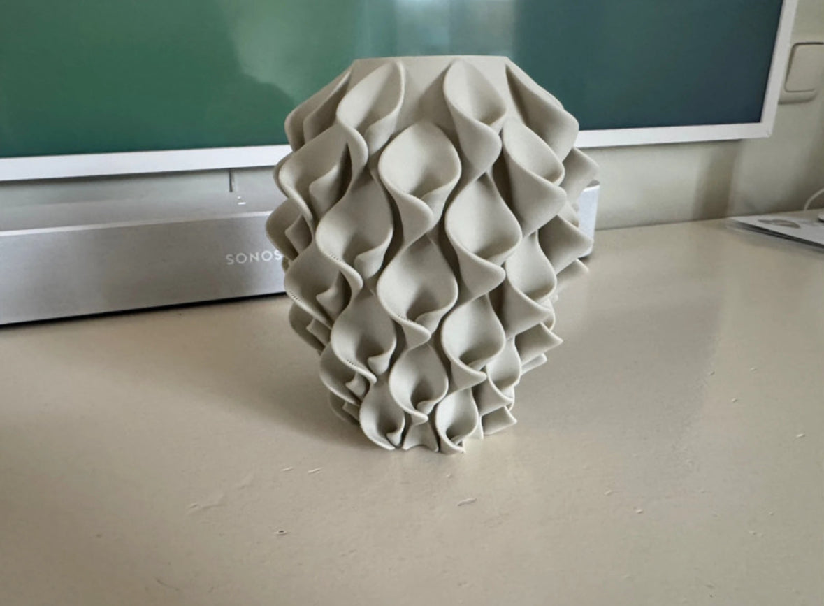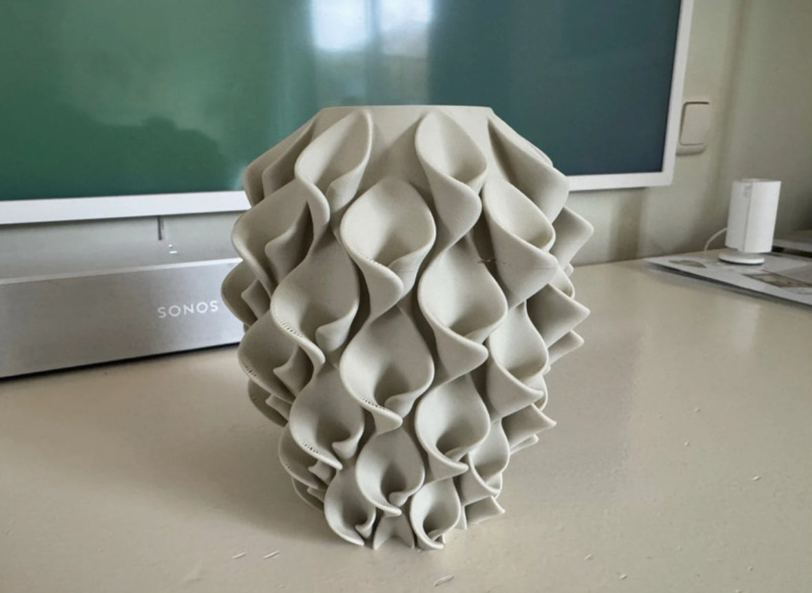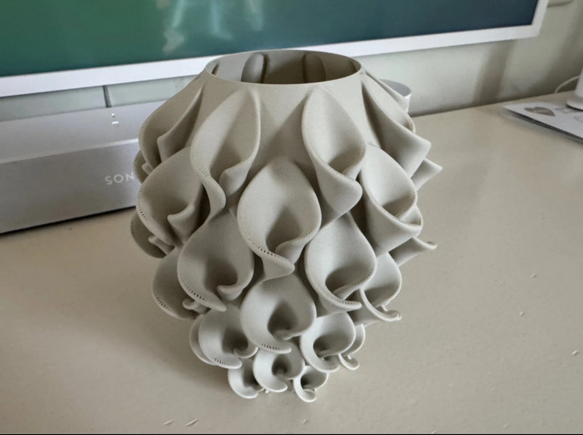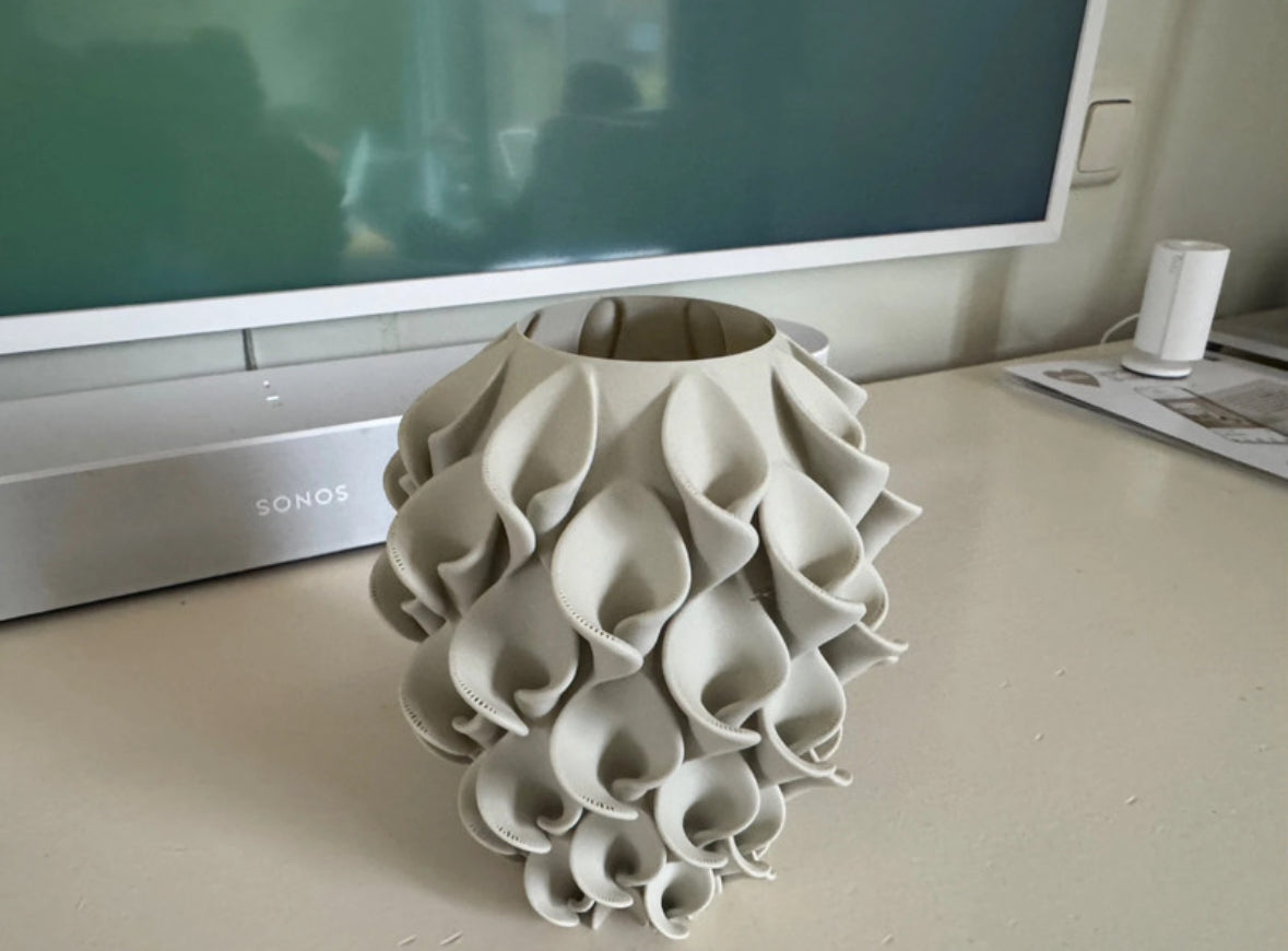 Unieke 3D-geprinte vaas, groot formaat. 18 cm hoog, in prachtig zijdeglans rood/goud. Alle fotos tonen dezelfde vaas Perfect als decoratie of voor kunst -zijde of droogbloemen. Alle foto’s tonen dezelfde vaas. Gemaakt van polylactide. Dit is biologisch afbreekbaar, biocompatibel en wordt geproduceerd uit hernieuwbare plantaardige grondstoffen. Niet waterdicht.